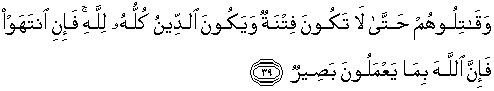 Dan perangilah mereka sehingga tidak ada lagi fitnah (dalam perkara agama : ketuhanan (الدين - الاءسلام mewajibkan الاءيمان - العلم : furuq), dan (sehingga) menjadilah agama itu seluruhnya (bebas) bagi Allah (لله : اله) semata-mata. Kemudian jika mereka berhenti (dari kekufurannya :كفر - tanpa لله dan gangguannya, nescaya mereka diberikan balasan yang baik) kerana sesungguhnya Allah Maha Melihat akan apa yang mereka kerjakan.